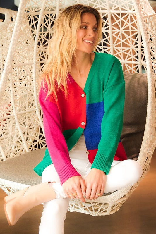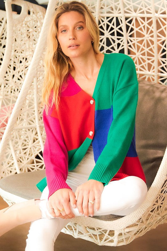 We’re loving the bold colorblocking on this sweater—it’s got that throwback 90's vibe and feels super wearable. The knit is mid-weight, not too thick or thin, and it’s soft without being fuzzy or itchy. It has a ribbed hem.